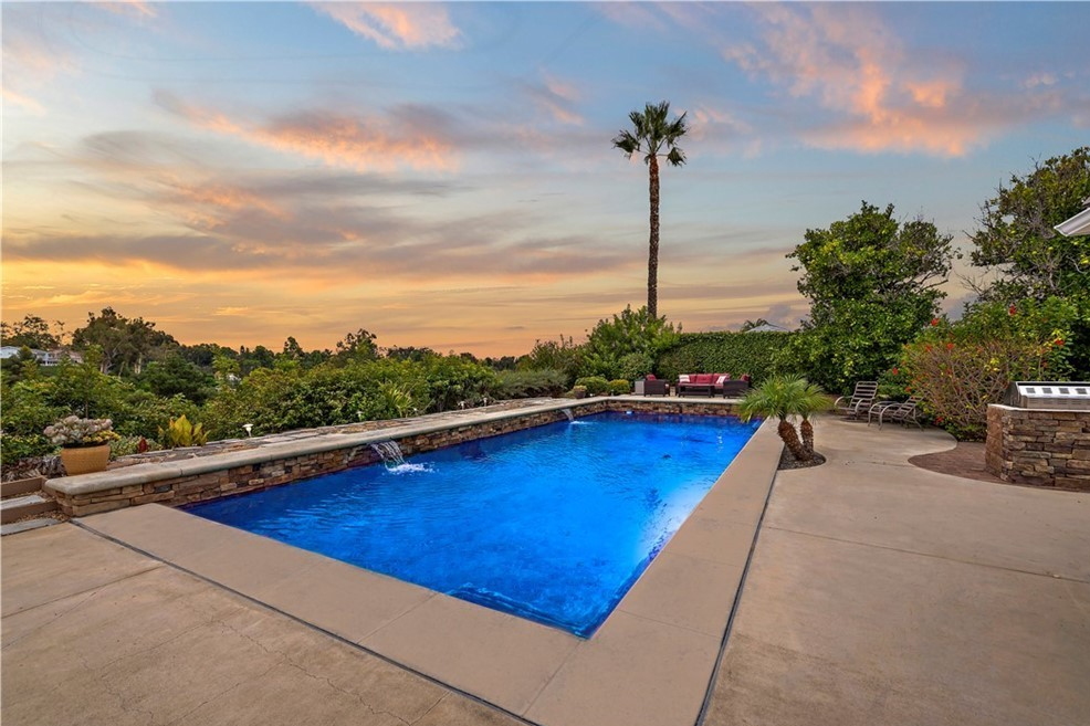 Hardwood floors with upgraded baseboards, crown molding, formal living room with fireplace, formal dining room, spacious family room, and upgraded kitchen with dining nook, granite counters, island, stainless steel appliances, and GE monogram 6 burner stovetops. The oversized master bedroom has recessed lights, French doors leading to the yard, a spacious bathroom with dual sinks, a walk-in shower, a soaking tub, and a large walk-in closet. The other 2 secondary bedrooms are nicely appointed and there is a nearby office area that could be converted to the 4th bedroom if desired. The inside laundry room is located off the oversized 3 car garage with epoxy floors, customized built-ins, and attic storage. The AMAZING YARD has an in-ground pool with waterfalls, a built-in BBQ island, extra space for basketball, a grassy area, fruit trees, panoramic views, and amazing sunset views!