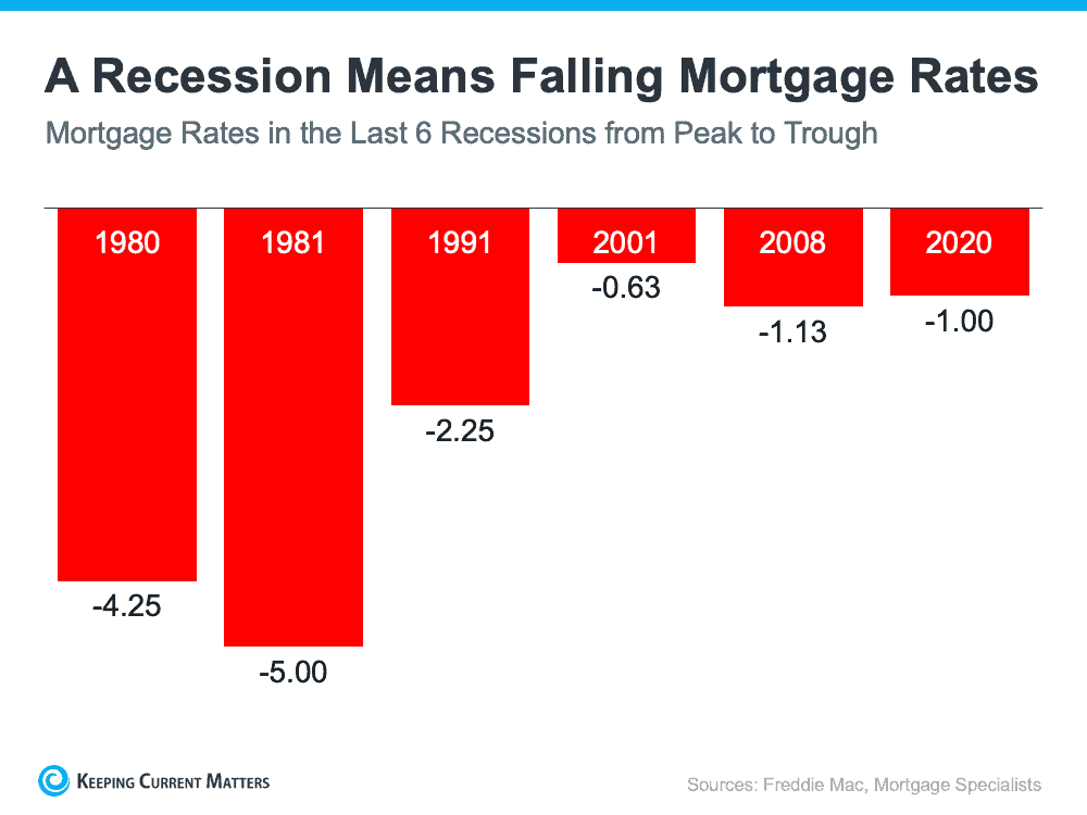 Research also helps paint the picture of how a recession could impact the cost of financing a home. As the chart below shows, historically, each time the economy slowed down, mortgage rates decreased.