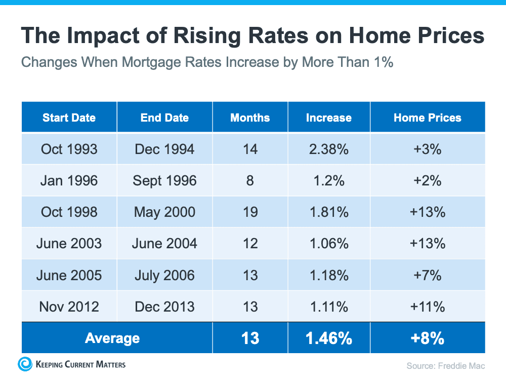 As the chart shows, mortgage rates jumped by at least 1% six times in the last thirty years. In each case, home values increased.