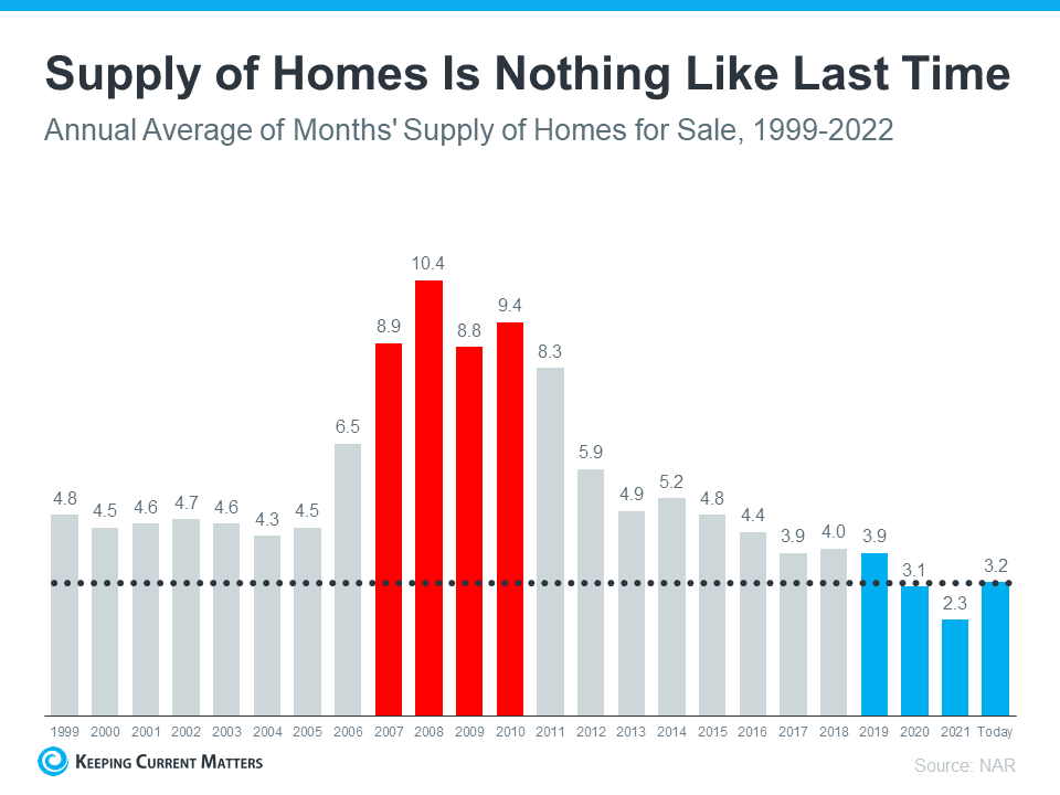For historical context, there were too many homes for sale during the housing crisis (many of which were short sales and foreclosures), and that caused prices to fall dramatically. Supply has increased since the start of this year, but there’s still a shortage of inventory available overall, primarily due to almost 15 years of underbuilding homes.