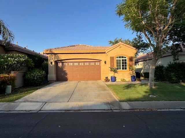 Beautiful golf course home. This home features a fantastic covered patio with mature landscapeing, gas firepit and a soothing water feature with awesome views. Take in the view while cooling off under gentle misters on a warm summer day. Enter the home and you are met with a 14ft rotunda entry way that leads to a light filled great room. All windows are tinted. The gourmet kitchen features stainless appliances, granite counters, eat at bar and lots of cupboard and counter space. Off the kitchen is a spacious laundry room. Primary suite has a door out to the patio, high ceilings, sumptuous spa like bathroom and large walk in closet. The second bedroom is in its own wing great privacy for your guests! The great room has a cozy fireplace and lots of entertaining space. Garage is large and has two spaces plus a space for your golf cart. The community is close to world class polo, numerous horse shows and the famous Coachella and Stagecoach festivals. There is a 27 hole golf course, fitness center with lots of classes included, tennis, pickleball, bocceball and 3 pools.