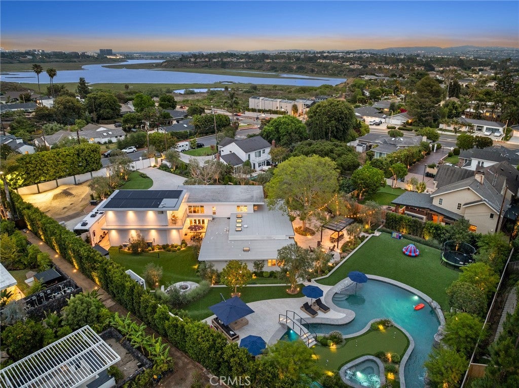 A “Trophy Property” in the truest sense, this irreplaceable Newport Beach family compound, masterfully redefined by the one-and-only Skout Interior Design, is sited on nearly an ACRE of private gated land just steps from the Back Bay. The result is a mid-century modern sanctuary designed for the highest level of tranquility, entertainment, and privacy. The heart of the home is a stunning open-concept kitchen and family area, where walls of glass dissolve the boundary to the outdoors, overlooking an expansive living space shaded by magnificent trees. A grand gated entrance opens to an immense driveway, offering extensive parking for multiple cars and recreational vehicles. The mid-century modern architecture, artfully set at an angle upon the lot, creates a home where air and light travel effortlessly through vaulted ceilings and massive, floor-to-ceiling glass walls. The residence thoughtfully accommodates family and guests with 4 bedrooms, 5 bathrooms, an office, a family room, a den, and a newly constructed 620 sqft. bonus room ideal for a gym or media lounge. Bespoke finishes like custom fabricated terrazzo, basalt tiles, leather granite and custom white oak cabinets are perfectly layered throughout the home . A newly built 3-car garage is a showcase in itself, featuring epoxy flooring, custom hex lighting, specialized cabinetry, a laundry area, and a sink. The harmonious landscape architecture, curated by Garden Studios Design, envelops the residence in natural beauty, over 43 mature trees creating a lush, private canopy. The sprawling grounds are a private resort unto themselves. A lazy river pool with a waterfall meanders under a bridge and wraps around a secluded spa island. Adjacent to the pool is huge play area or potential ADU/pool house site with underground utilities. Entertain year-round with a built-in BBQ bar with a sink, a putting green, and a large dirt track offering future possibilities for a pickleball court or other amenities. Simply put, 2301 Santiago Drive is a fully-realized world of sophisticated style and unparalleled luxury—a once-in-a-lifetime opportunity to acquire a true family compound in Newport Beach.