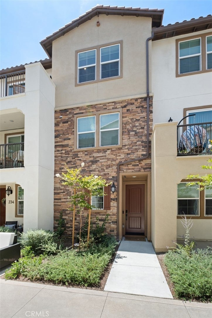Luxury townhome in the newly constructed community of Saddleback Place! This thoughtfully designed Plan 4 model features over $45K in premium upgrades including flooring, lighting, upgraded appliance package, countertops, ceiling fans, shiplap accent wall, and window coverings, all in a prime location near the pool and BBQ area. Arrive through your 2-car tandem garage with keyless entry and a side jog-out space perfect for a home gym or office. The main level features an airy open-concept great room designed for entertaining and everyday relaxation. Living and dining areas flow outside onto a sunny balcony perfect for a BBQ and seating area. Enjoy casual bites and conversation at the center island, complemented with chic quartz countertops and white Shaker cabinets. Home chefs will love the quality kitchen appliances and bonus storage pantry. Wake up to peekaboo ocean views and breezes from the primary and secondary bedroom. All three bedrooms offer great natural light, and three full bathrooms provide excellent privacy and convenience for family and guests. The primary suite features a larger double-sink vanity as well as professional organizers in the walk-in closet. Additional upgrades include a tankless water heater, mobile garage control, and leased solar with a fixed monthly bill of just $84. The Saddleback Place community offers exceptional amenities with NO MELLO ROOS, including a sparkling pool with cabanas, tot lot playground, walking paths, and BBQ areas. You'll have easy access to parks, trails, restaurants, shopping, and schools, plus exclusive Lake Mission Viejo access for hiking, fishing, boating, concerts in the park and seasonal events. This home delivers the perfect blend of luxury and lifestyle in one of Mission Viejo's most desirable new communities.